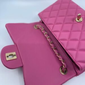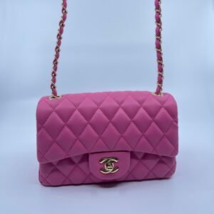 Unesite dašak luksuza i bezvremenske elegancije u svoju garderobu s ovom predivnom Chanel Mini Flap torbicom u vibrantnoj ružičastoj boji. Ovaj model predstavlja savršen spoj sofisticiranog dizajna i praktične kompaktnosti, inspiriran kultnom Chanel Classic Flap torbom.