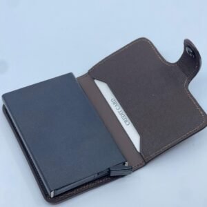 Inovativan i kompaktan držač kartica s mehanizmom za automatsko izbacivanje, dizajniran za brzi pristup i maksimalnu sigurnost. Vanjski premaz od izdržljive kože s prepoznatljivim uzorkom, dok unutrašnjost skriva aluminijski okvir koji čuva kartice od savijanja i elektroničkog krađe (RFID zaštita).
