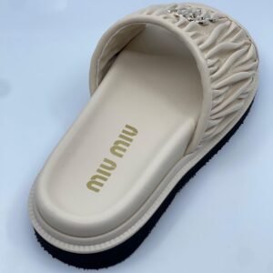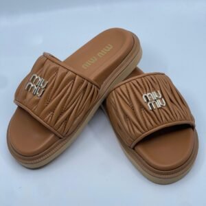Elegantne Miu Miu natikače s prepoznatljivim Odor uzorkom donose sofisticiran izgled i udobnost u svakom koraku. Prednji remen ukrašen je metalnim logotipom koji naglašava luksuzan karakter ovih natikača.
