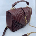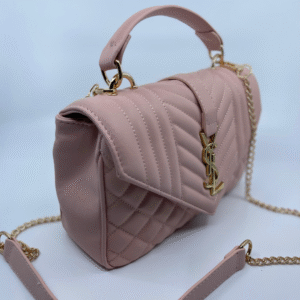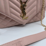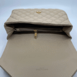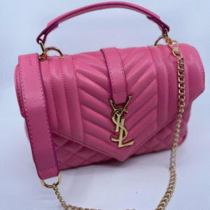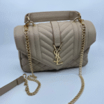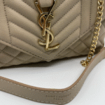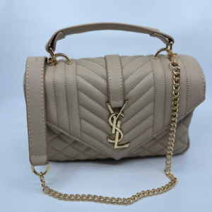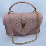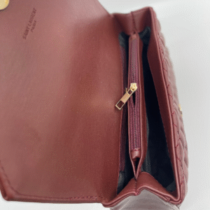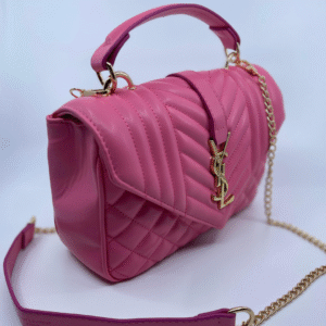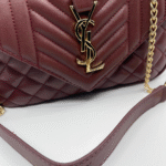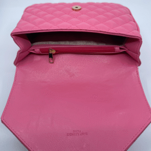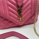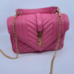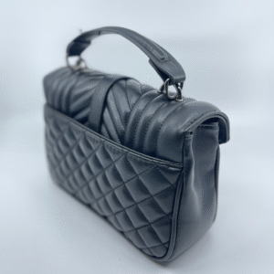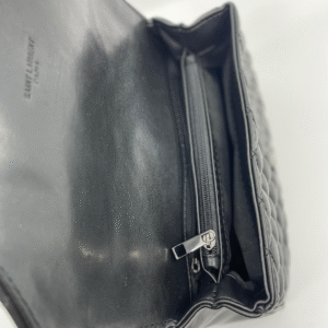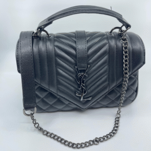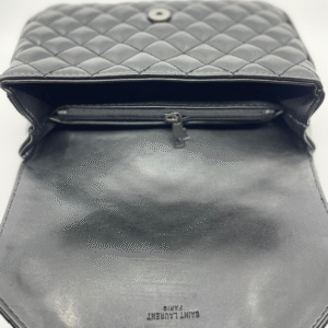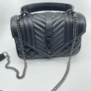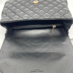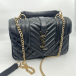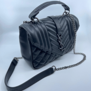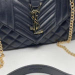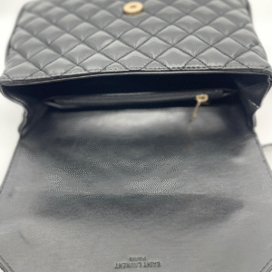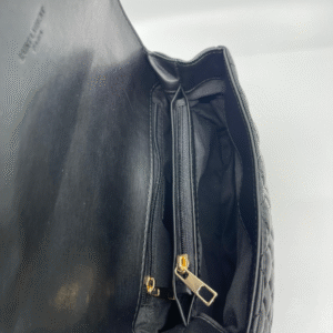 Ova luksuzna ženska torba brenda Yves Saint Laurent (YSL) savršen je spoj klasične elegancije i moderne sofisticiranosti. Izrađena je od visokokvalitetne, glatke crne kože s prepoznatljivim prošivom u obliku chevron i dijamantnog uzorka, što torbi daje izražajnu teksturu i dubinu. Prednji preklop zatvara se magnetnim zatvaračem, a krasi ga upečatljiv zlatni metalni YSL monogram, koji dodatno ističe prestiž i stil ovog modnog komada.