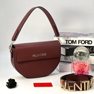 Na prednjem poklopcu ističe se metalni VALENTINO logo u zlatnoj boji, dok crni rubni detalji i kontrastne ivice naglašavaju čistu liniju dizajna. Torba dolazi s dvije opcije nošenja: